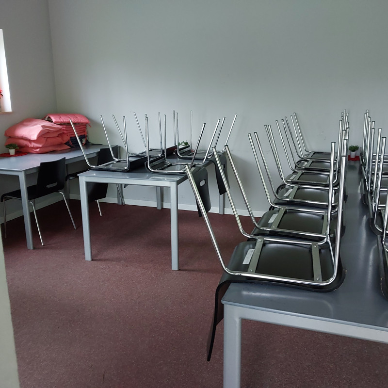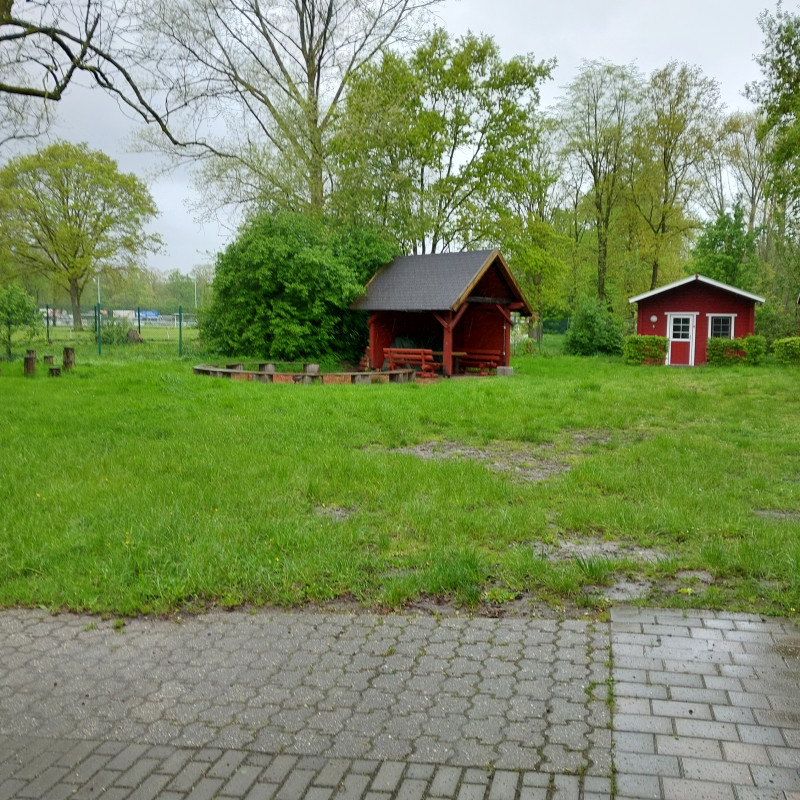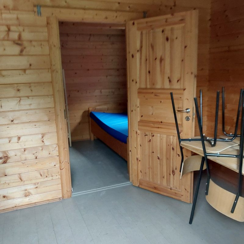 Das Mehrzweckgebäude (ca. 80 qm) bietet einem Gruppenraum mit integrierter Küche und einen Putzmittelraum im Durchgang zu den Waschräumen.