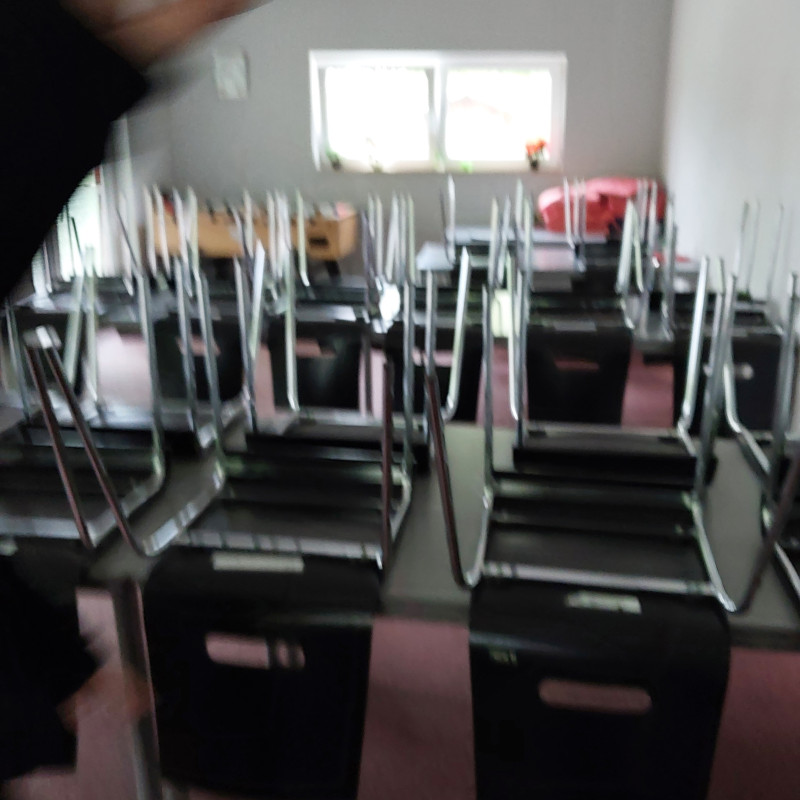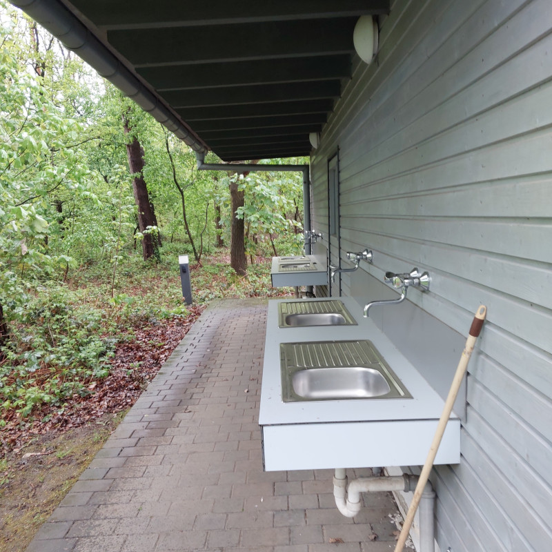 An der Rückseite des Mehrzweckgebäudes sind mehrere Außenspülen installiert.